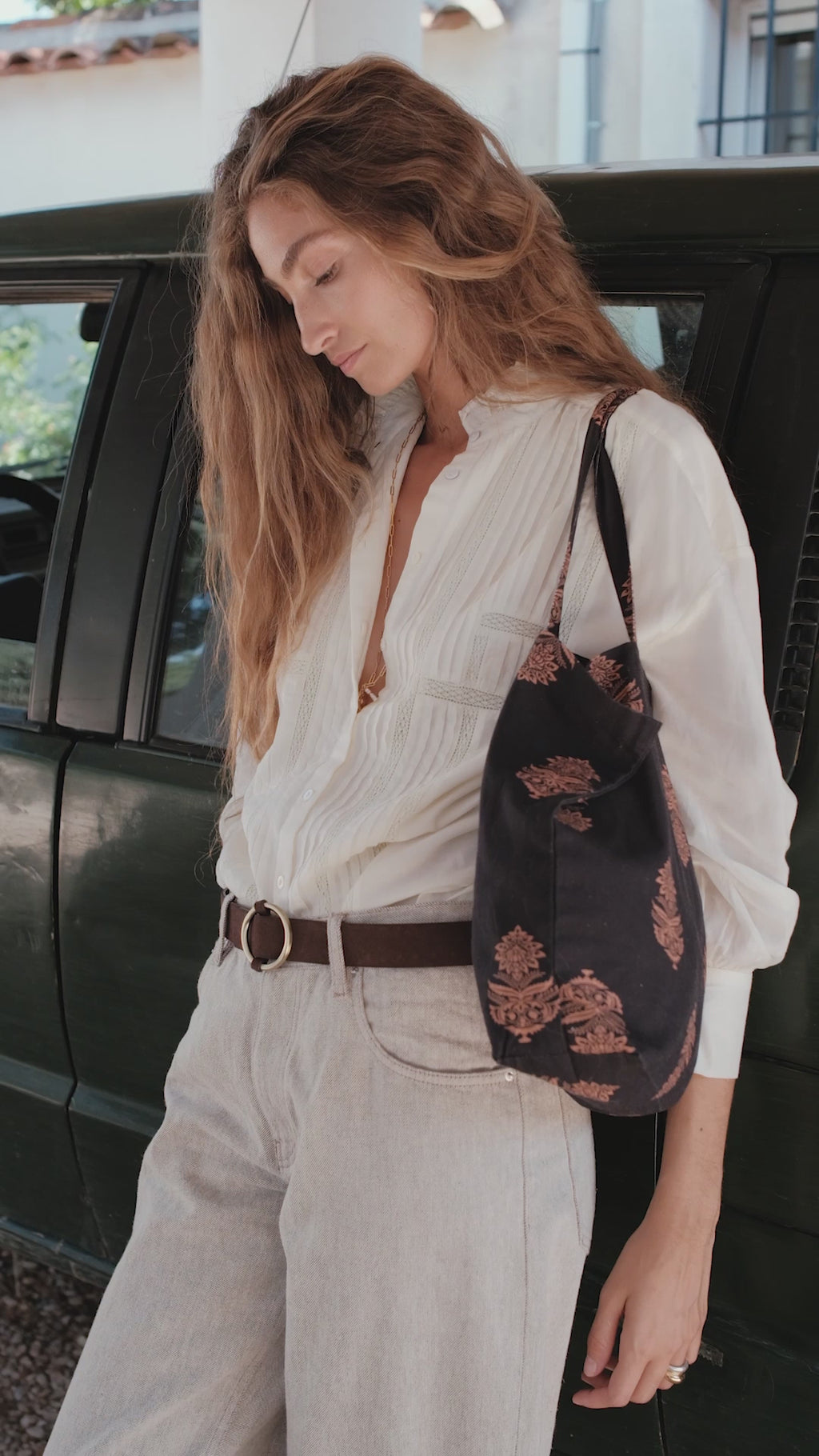 Delicada y vaporosa blusa de manga larga con doble tejido de voile de algodón. Esta toda decorada con unas delicadas jaretas y tiras de encaje de algodón.